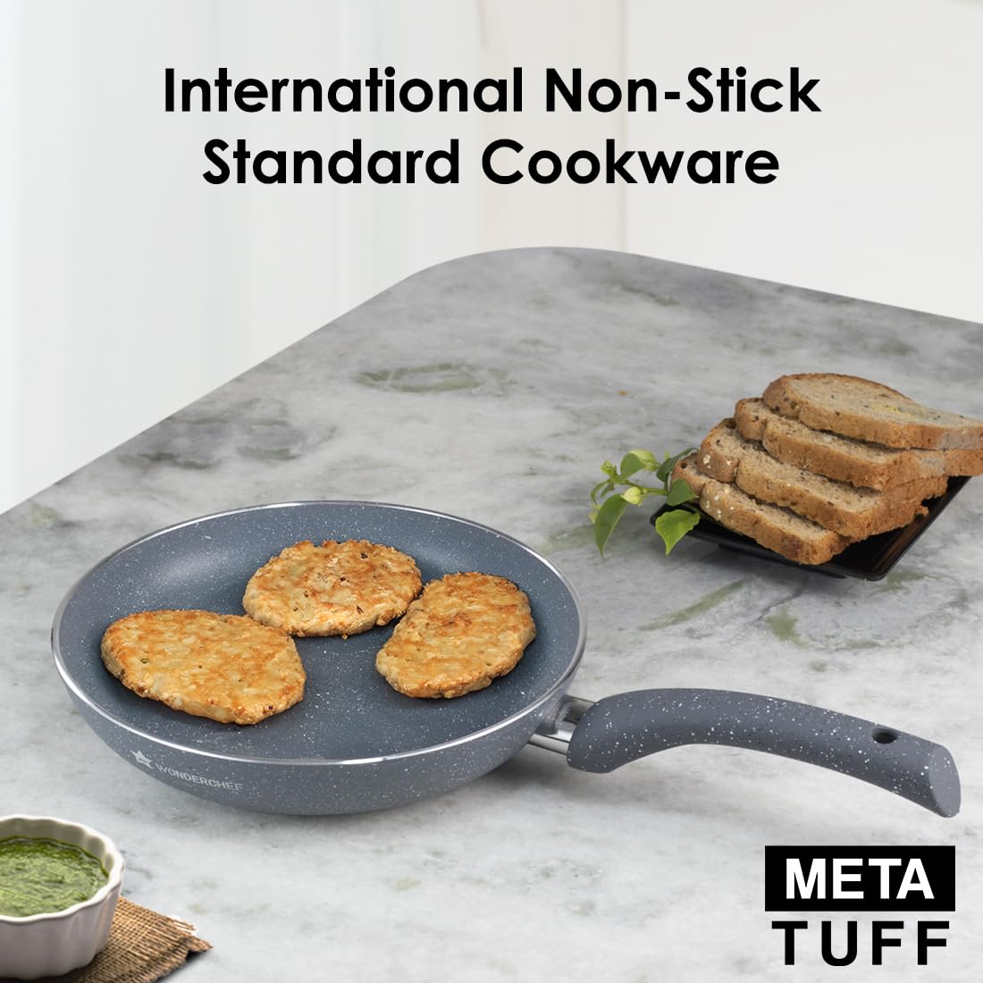 Wonderchef non-stick cookware is crafted from cold rolled sheets of 99.9% pure-grade virgin aluminium. The cookware comes with proprietary multi-layered healthy non-stick coatings like Meta-Tuff, Greblon C3, etc., and specially molded for ergonomic use. The non-stick coating is food-safe, free from PFOA, PFAS, and other harmful metals, making Wonderchef non-stick cookware the healthiest.