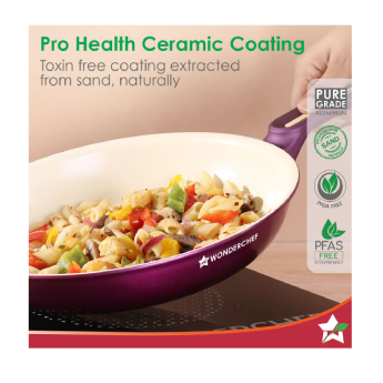Wonderchef non-stick cookware is crafted from cold rolled sheets of 99.9% pure-grade virgin aluminium. The cookware comes with proprietary multi-layered healthy non-stick coatings like Meta-Tuff, Greblon C3, etc., and specially molded for ergonomic use. The non-stick coating is food-safe, free from PFOA, PFAS, and other harmful metals, making Wonderchef non-stick cookware the healthiest.
