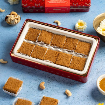 Cashew Caramel Burfee by Haldiram’s. This 250 g treat blends premium cashews and caramelized biscuits into a soft, velvety burfee that melts in your mouth. Each bite offers a delicate symphony of nutty sweetness and buttery caramel tones, beautifully balanced for those who love a more layered dessert experience.