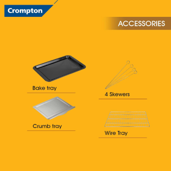 * Includes - OTG, User Manual with warranty card, Baking Tray, Wire Grill, Crumb Tray, 4 Skewers, Removal Tong, Crompton Recipe Book