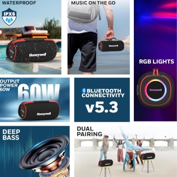 Honeywell Trueno U500 Bluetooth Speaker: a robust 60W speaker designed for powerful sound with deep bass radiators. Enjoy up to 18 hours of playtime and an IPX6 waterproof rating. With TWS capability for stereo pairing, vibrant RGB lights, and versatile connectivity options including SD card, AUX, and USB Type-C, this speaker also features a built-in mic and dual 93mm drivers for an exceptional audio experience.