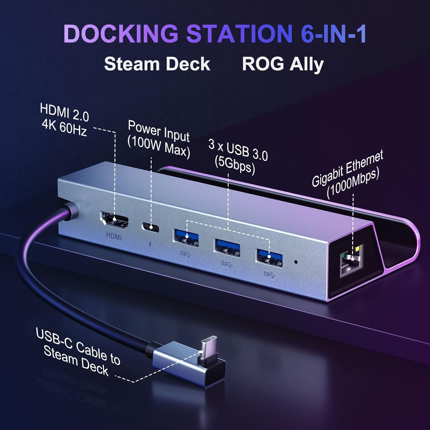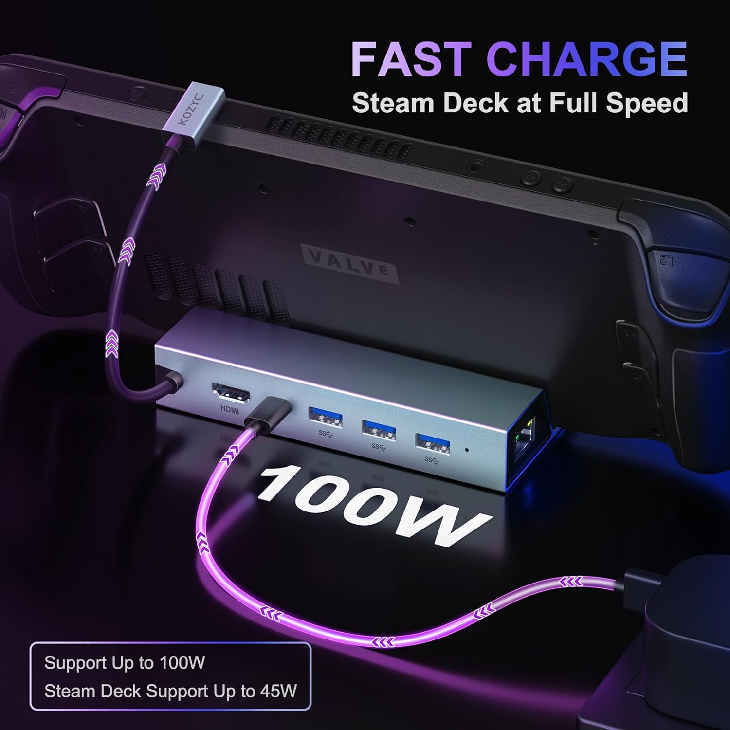 * 6-in-1 Docking Station this KOZYC USB-C hub is specifically designed for Steam Deck, which with 1*HDMI output 4K 60Hz, 1*Gigabit Ethernet 1000Mbps, 3*USB 3.0 5Gbps, and USB Type-C 100W PD charging port.