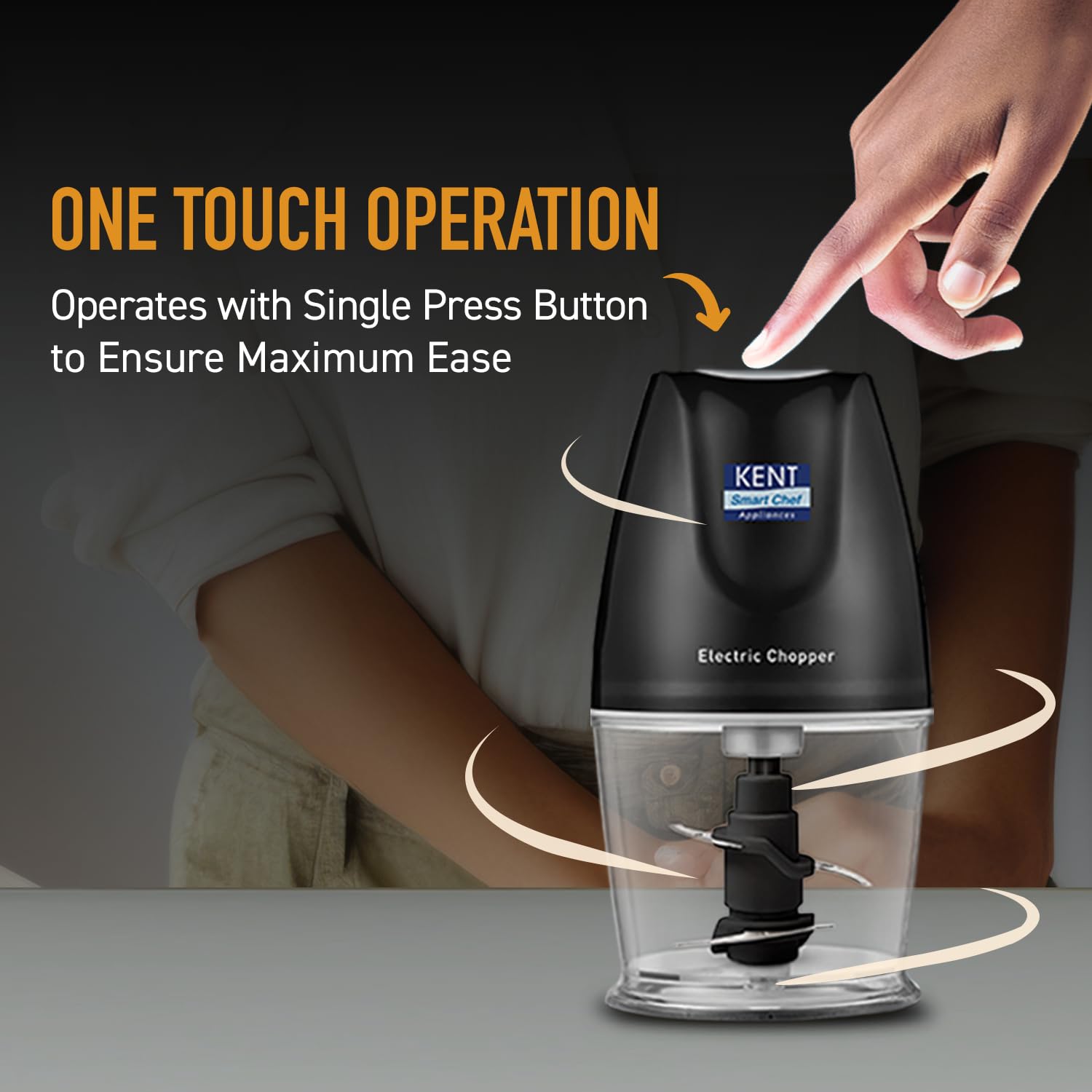 Welcome the smart KENT Electric Chopper Black to your kitchen and get rid of all the tedious chopping. Equipped with sharp stainless steel double chopping blades, this 250W chopper is perfect to get your kitchen chores done quickly and hygienically. Just with a press of single button you can chop your ingredients to fine, medium, or coarse textures. Apart from veggies, this chopper can also be used to whisk cream using the plastic whisking attachment. It features a 400ml chopping bowl made of food-grade plastic to ensure healthy and hygienic cooking. Also, this transparent bowl lets you keep a check on chopping level without opening the lid. To ensure maximum stability while chopping, this product has anti-skid ring at the bottom of the bowl.