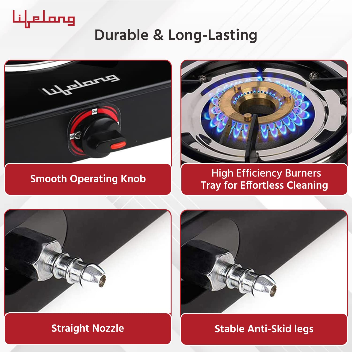 The LIFELONG Glass Top Gas Stove - Single Burner is the perfect addition to any modern kitchen, combining sleek design with high functionality. Crafted with a premium, heat-resistant glass top, this stove offers durability and easy cleaning, while its single burner ensures efficient cooking. Ideal for small kitchens or for those who need a compact cooking solution, the stove features a powerful burner that provides consistent heat for quick and even cooking. The ergonomic knobs allow precise flame control, and its stylish design adds an elegant touch to your cooking space. Whether you're preparing a quick meal or simmering your favorite dish, the LIFELONG Gas Stove is built to deliver reliable performance every time.