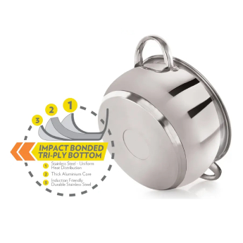 NIRLON Impact Bonded Stainless Steel Cookware makes your cooking healthy , quick and easy. Impact Bonded tri-ply technology implies three different layers of metal bonded together. Stainless steel-Aluminum-Stainless Steel under high impact to form a bottom eliminating air gaps between the metal layers making the bottom eliminating air gaps between the metal layers making the bottom highly durable while ensuring the distribution of heat quick and easy.