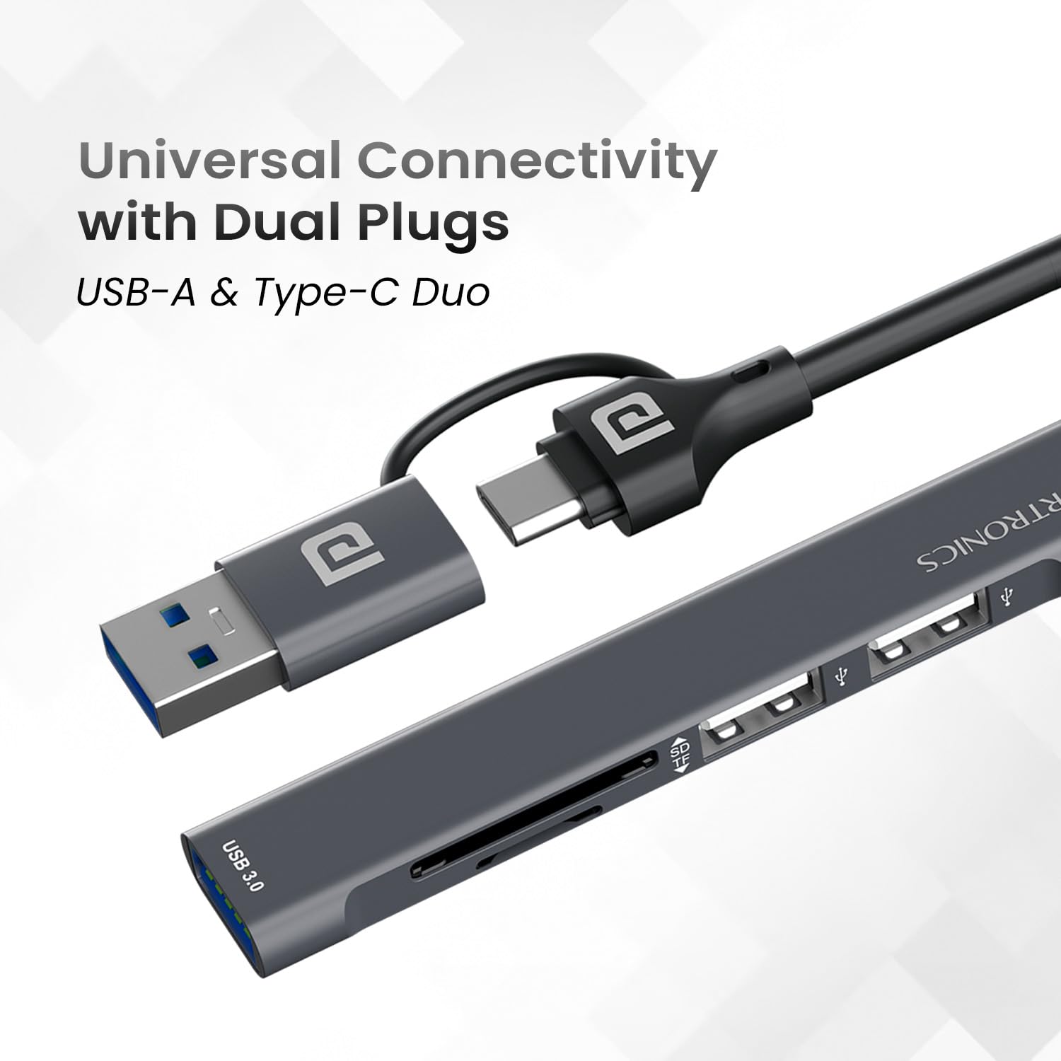 Introducing the Portronics Mport 31 Plus, a 5-in-1 USB Hub. This versatile hub offers seamless multitasking with a USB 3.0 port, 2 USB 2.0 ports, an SD Card Reader, and a MicroSD Card Reader. Experience fast data transfers of up to 5 Gbps in the USB 3.0 port and 480 Mbps in the USB 2.0 ports, perfect for connecting various devices. It offers dedicated slots for microSD and SD cards. With USB-A and USB-C plugs, it is compatible with PCs, Macs, Smartphones, and Tablets. Its durable aluminium alloy body, and compact design, ensure portability wherever you go.