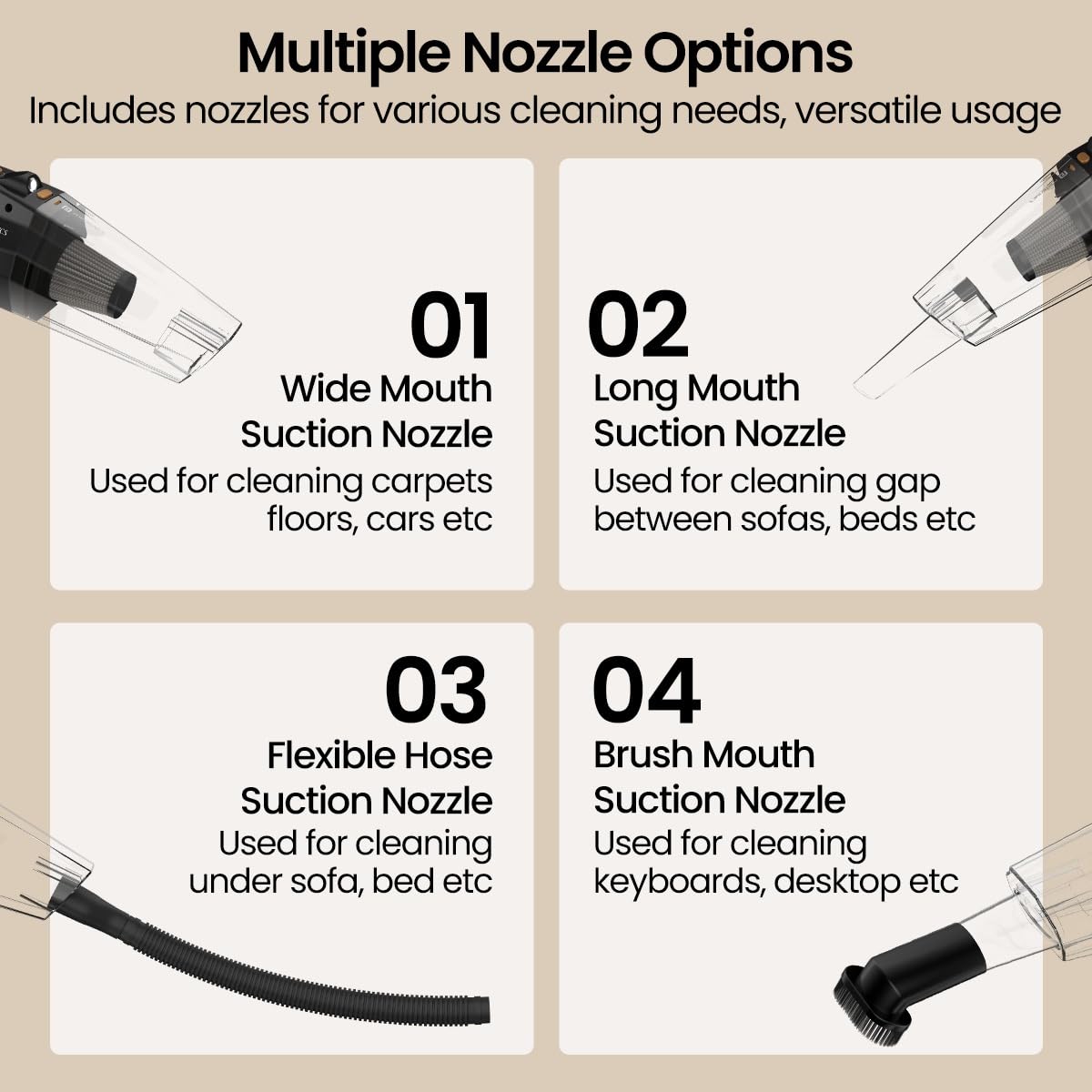 The Portronics Mopcop rechargeable handheld vacuum cleaner features a cordless design, making it portable and convenient for cleaning anywhere with its powerful rechargeable battery that allows extended sessions. It includes an eco-friendly, reusable HEPA filter that effectively traps dust and allergens, and is easy to wash and maintain for long-lasting performance. The built-in LED flashlight illuminates dark corners and under furniture, ensuring thorough and efficient cleaning. With a high suction power, Mopcop delivers deep, effective cleaning on various surfaces, including car interiors, carpets, upholstery, and hard floors. It also comes with multiple nozzles tailored for diverse cleaning tasks, allowing you to effortlessly switch between them to handle any mess. This versatile and efficient vacuum cleaner ensures a spotless home with ease and convenience.