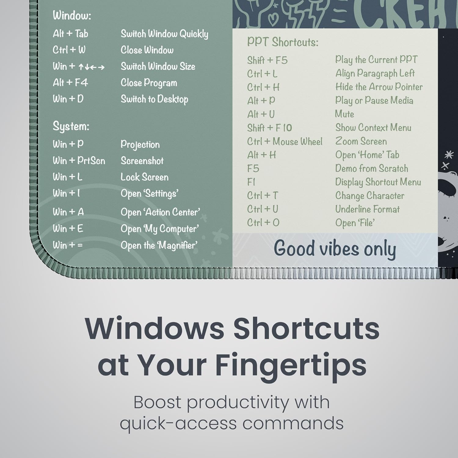 * Effortlessly Boost Productivity The Portronics Comfipad 3 Extended Mouse Pad features Windows Shortcuts Design, keeping essential shortcuts at your fingertips for quick, efficient navigation.