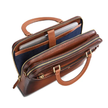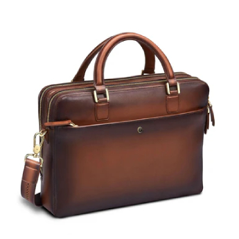 For The Modern Businessman, The Chester Slim Laptop Bag Fits The Part. With A Streamlined Design, And Subtle Vintage Touches, You Can Be Assured The Slim Profile Will Pair Nicely With Any Finely Cut Suit. Features Such As The Unique Brogue Handwork Design On The Strap, Quick Access Pockets, Advanced RFID Pockets For Your Bank Cards, Plush Microfiber Quilting In Complementing Blue, Footed Bottom Studs, Saddle Stitching And Padded Shoulders Adds To The Overall Appeal. Taking Inspiration From The Renaissance Technique By Leonardo Da Vinci's ‘Sfumato’ That Creates A Rare, Original Colour, The Edges, Hand Painted By Highly Skilled Craftsmen, Gradually Darkens The Cognac Color As It Imperceptibly Passes From One Shade To Another Giving This Bag An Identity Of Its Own.
