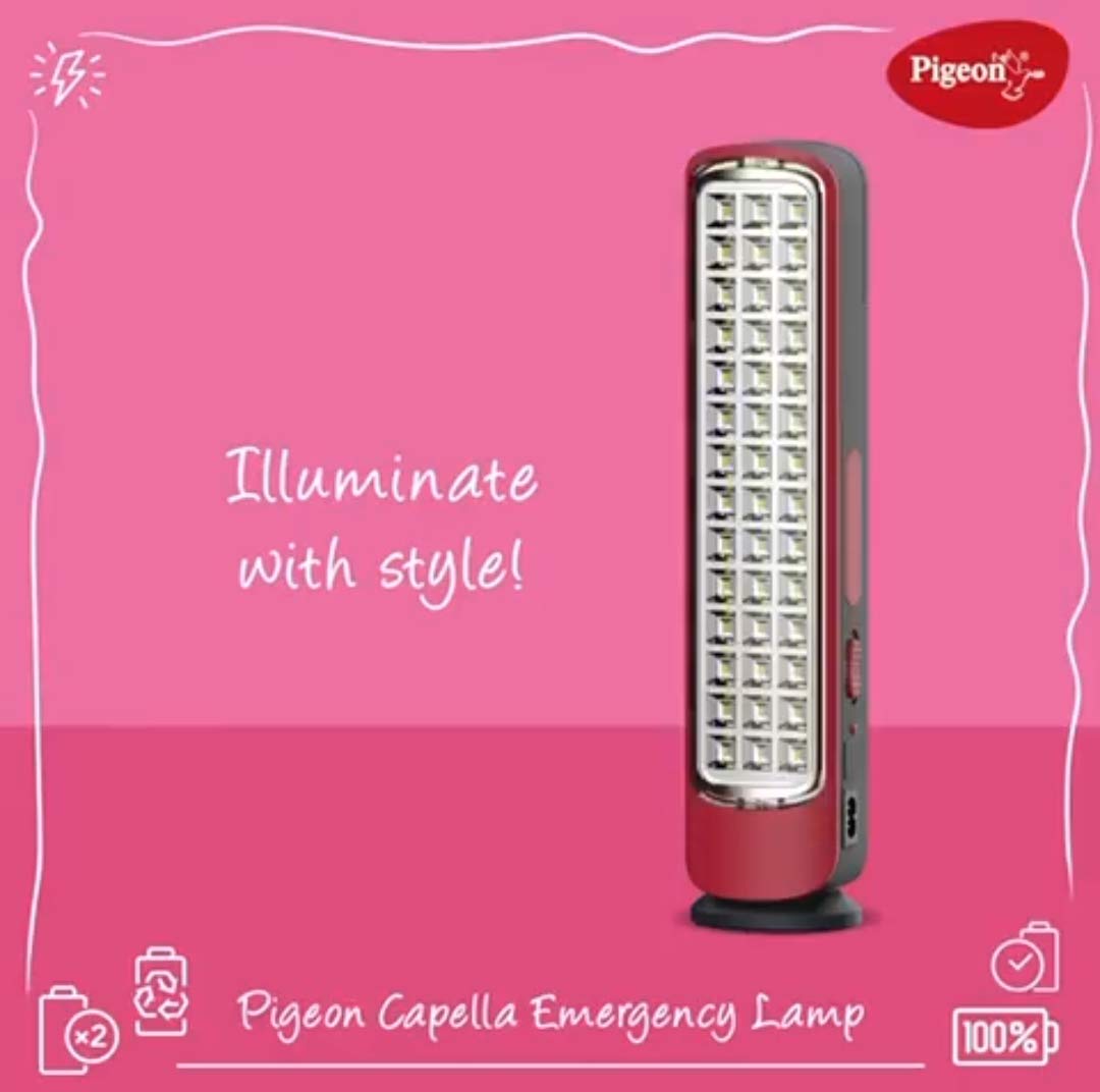 The Pigeon Capella LED Rechargeable Emergency Lamp is a reliable lighting solution designed to provide illumination during power outages, outdoor activities, or any situation requiring portable lighting.