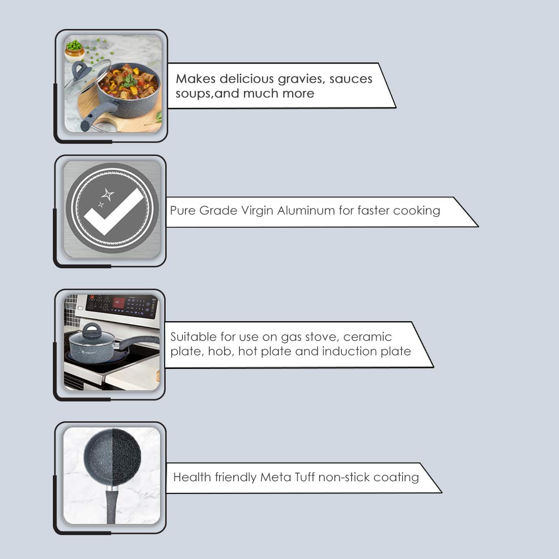 Wonderchef non-stick cookware is crafted from cold rolled sheets of 99.9% pure-grade virgin aluminium. The cookware comes with proprietary multi-layered healthy non-stick coatings like Meta-Tuff, Greblon C3, etc., and specially molded for ergonomic use. The non-stick coating is food-safe, free from PFOA, PFAS, and other harmful metals, making Wonderchef non-stick cookware the healthiest.