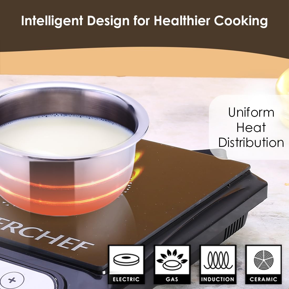 Wonderchef Stainless steel cookware is made only from superior 304 quality stainless steel, which is anti-rust and of the highest 18/10 grade. These steel pans last longer and carry a warranty of up to 10 years against rusting, cracking, and material defects. To overcome the low conductivity of steel, these Wonderchef pans are made in 3-ply steel or have a 3-ply bottom. A layer of high-conductivity aluminium is sandwiched between