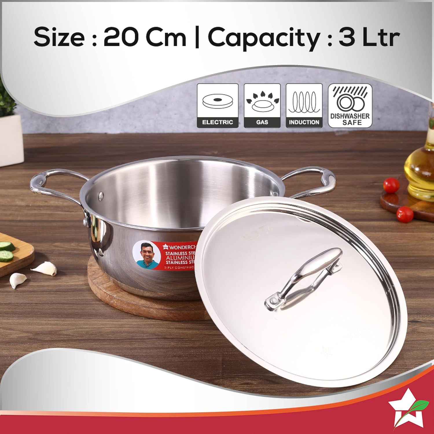 Wonderchef Stainless steel cookware is made only from superior 304 quality stainless steel, which is anti-rust and of the highest 18/10 grade. These steel pans last longer and carry a warranty of up to 10 years against rusting, cracking, and material defects. To overcome the low conductivity of steel, these Wonderchef pans are made in 3-ply steel or have a 3-ply bottom. A layer of high-conductivity aluminium is sandwiched between the steel layers for uniform heating and better cooking results.