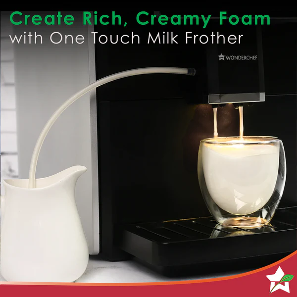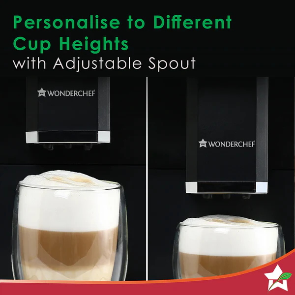 You can enjoy freshly brewed cups of coffee anytime you want with the Wonderchef Regalia Fully Automatic Coffee Machine. It is an excellent addition to your kitchen because it has automatic cleaning, up to 11 preset brewing settings, one-touch control of the milk frother, and an up to 17.78 cm (7) capacitive touch screen. In addition, you can grind your beans into a range of textures with this coffee machine, from coarse grindings to fine powder with its up to four-step adjustable conical burr grinder. Moreover, with its movable spout height, this coffee maker enables you to make customised beverages in cups and mugs of various heights.Warranty: 2 years
