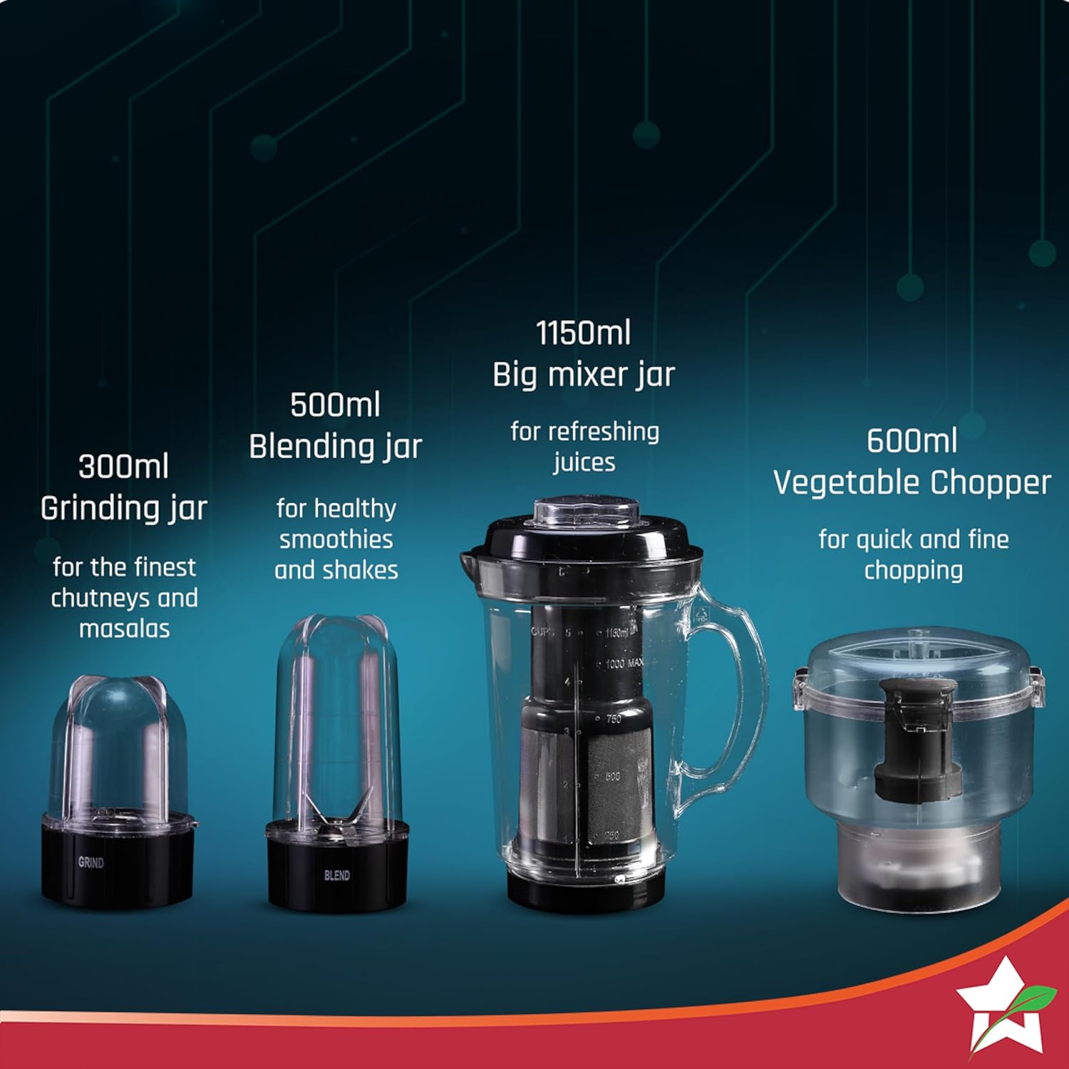 Included Components Machine, Big Mixer Jar, Blending Jar, Dry-Grinding and Chutney Jar, Chopper, Cover Lid, Juicer Attachment, Pusher, Wet Blending Blade for Tall Jar & Mixer Jar,Dry Grinding & Chutney Blade for Short Jar, Seasoning Cap, manuals