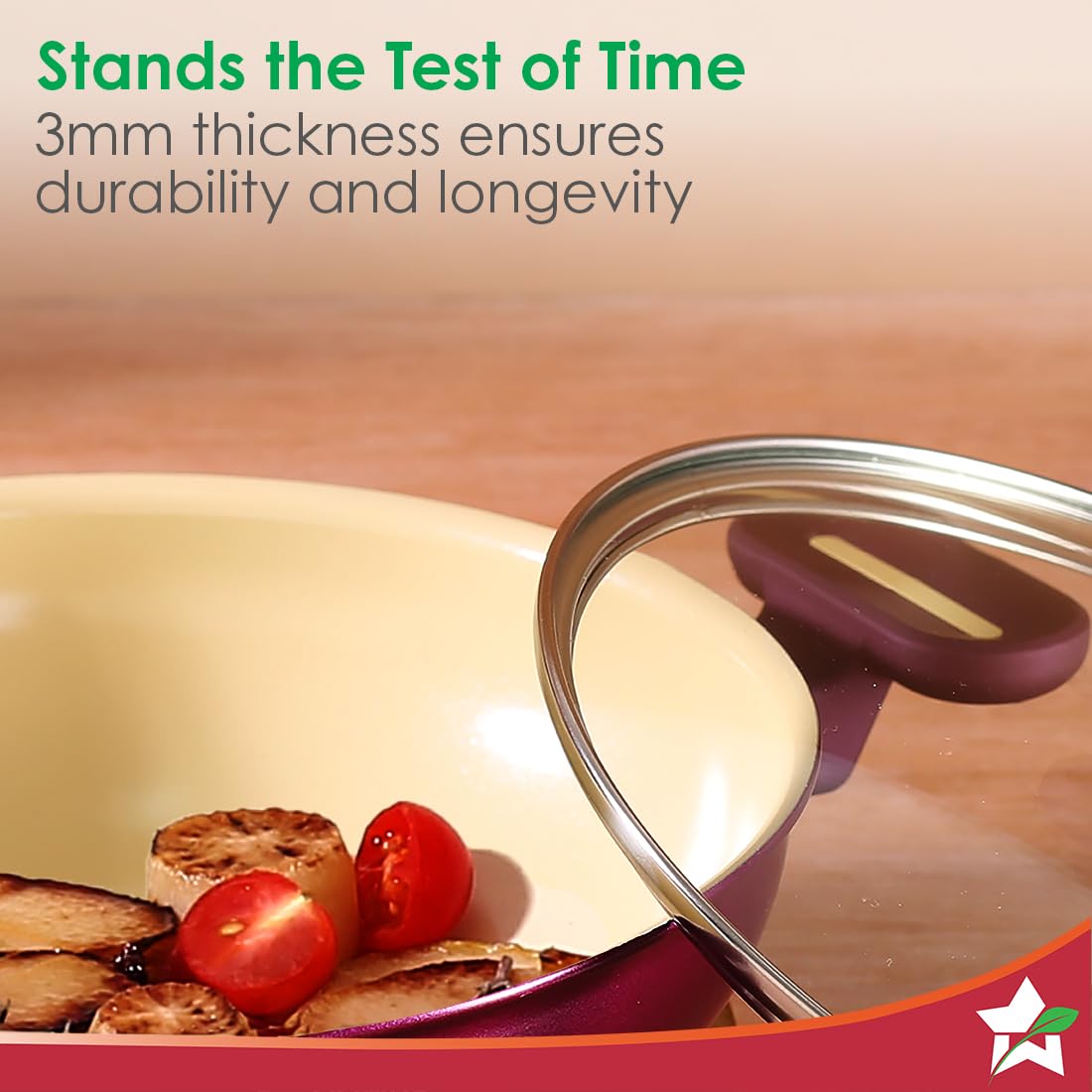 Wonderchef non-stick cookware is crafted from cold rolled sheets of 99.9% pure-grade virgin aluminium. The cookware comes with proprietary multi-layered healthy non-stick coatings like Meta-Tuff, Greblon C3, etc., and specially molded for ergonomic use. The non-stick coating is food-safe, free from PFOA, PFAS, and other harmful metals, making Wonderchef non-stick cookware the healthiest.