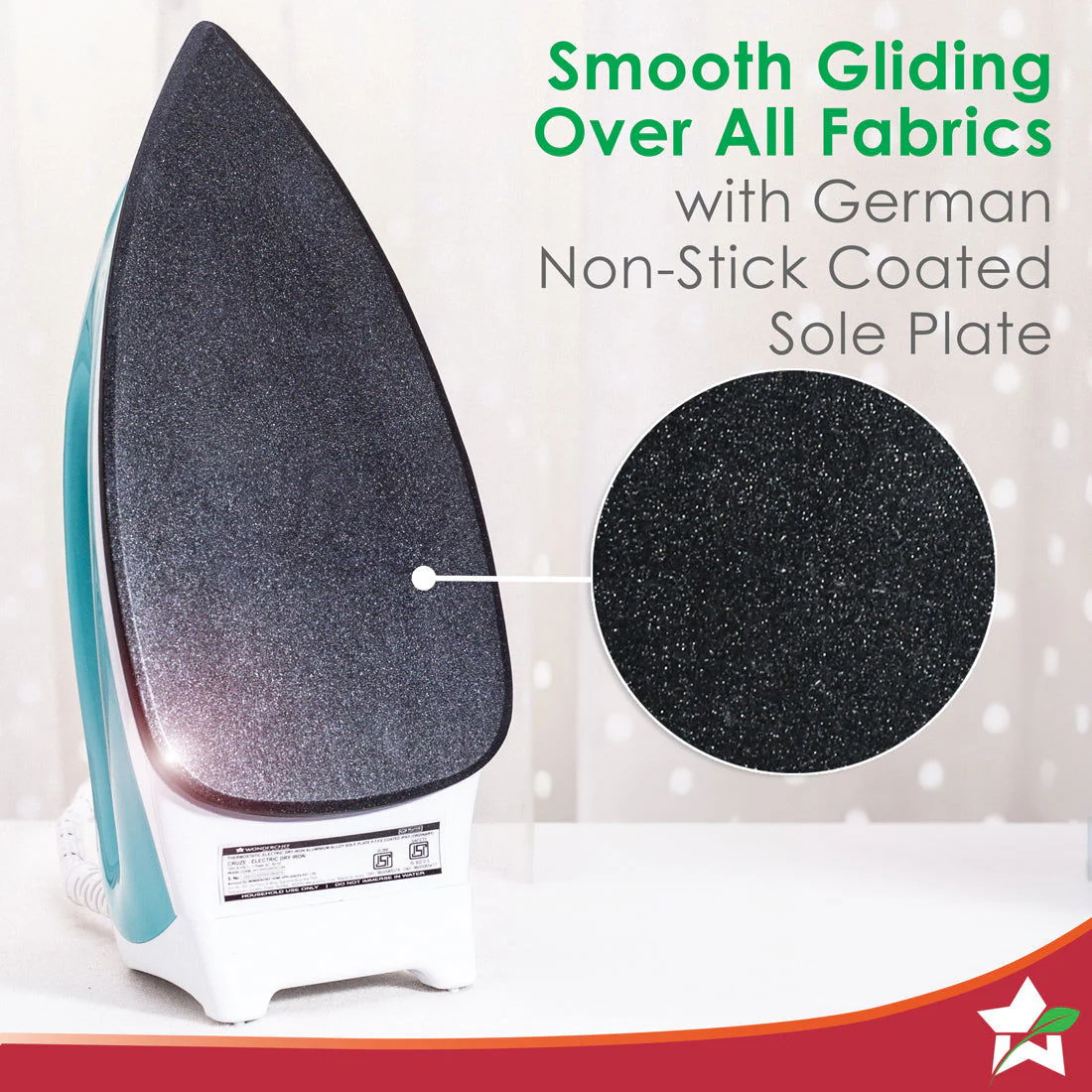 * German non-stick coated sole plate facilitates smooth gliding over fabrics.