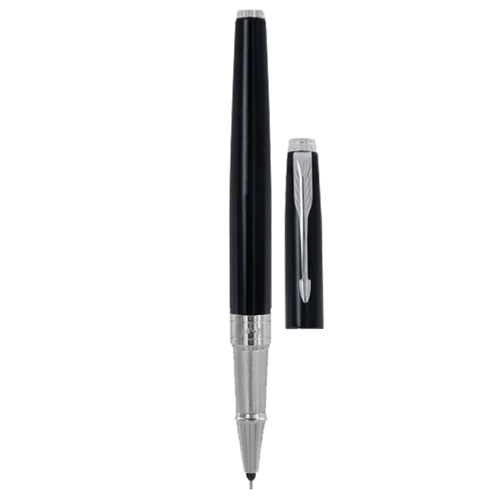 Experience sleek design and seamless writing with the Parker Aster Lacque Black Roller Ball Pen, featuring a sophisticated chrome trim.