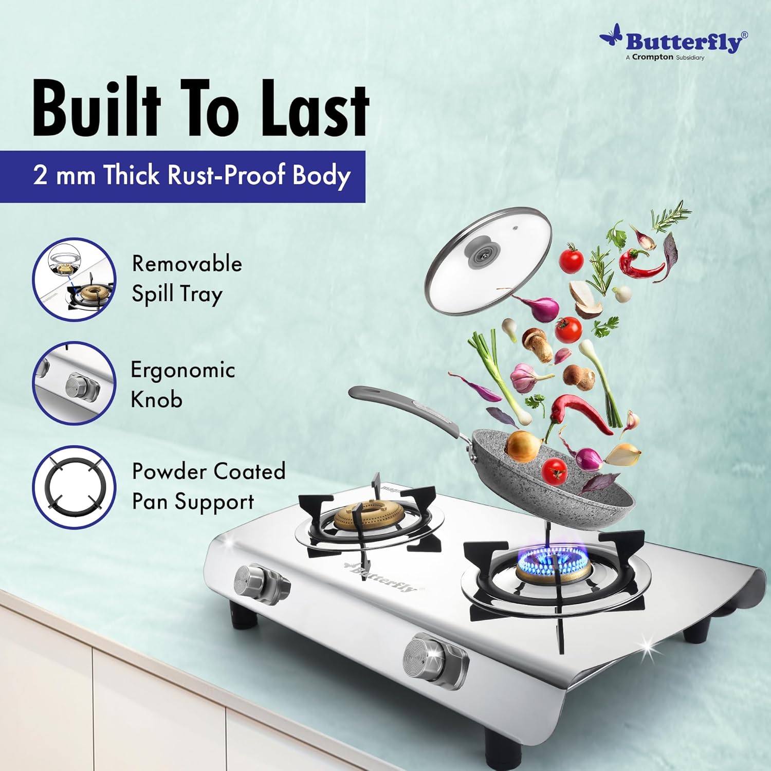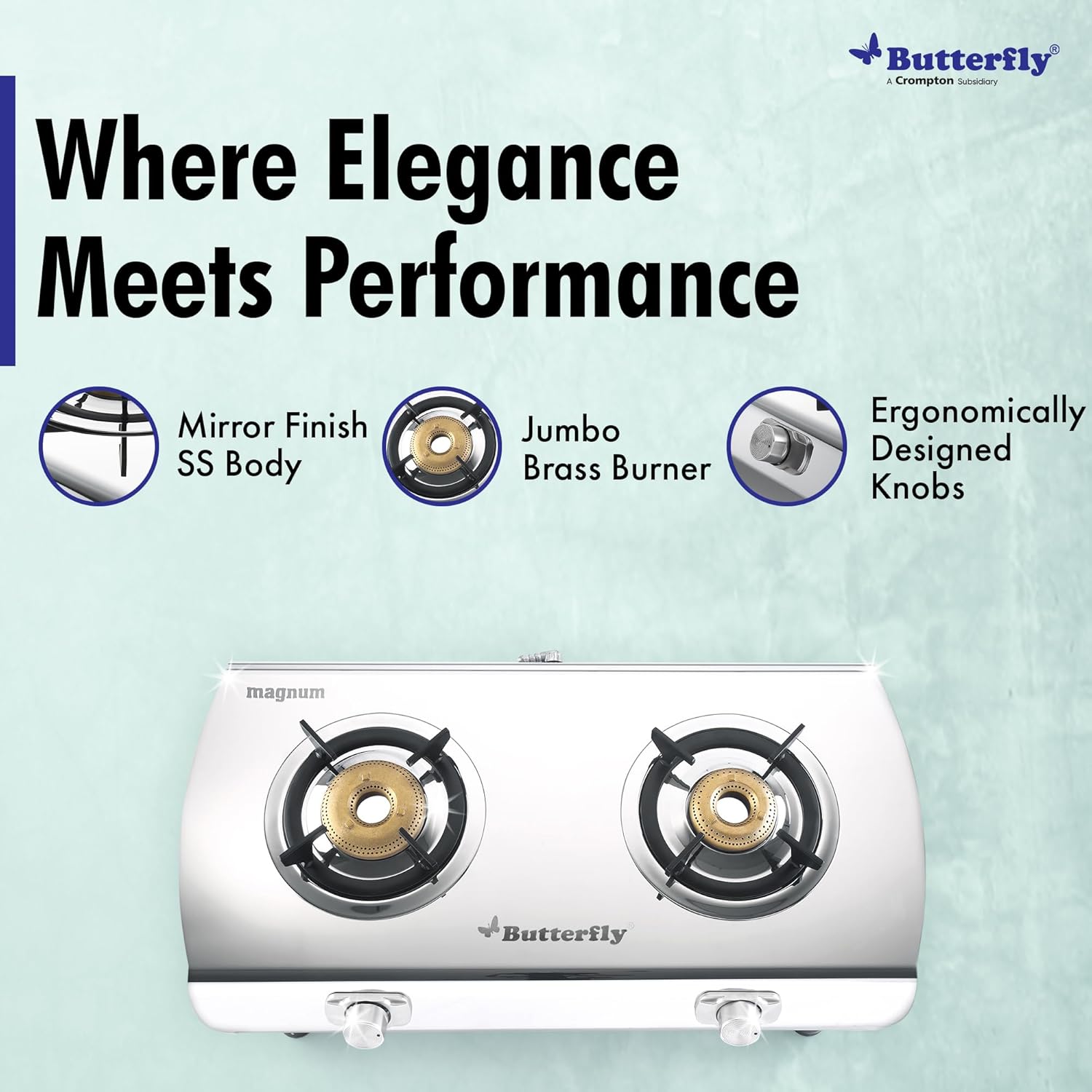 The Butterfly Magnum 2-Burner Gas Stove is designed for those who seek efficiency and elegance in their kitchen. Featuring two high-performance brass burners, this gas stove ensures fast, uniform heating while saving fuel. Its compact yet stylish design makes it an ideal choice for small to medium-sized kitchens.