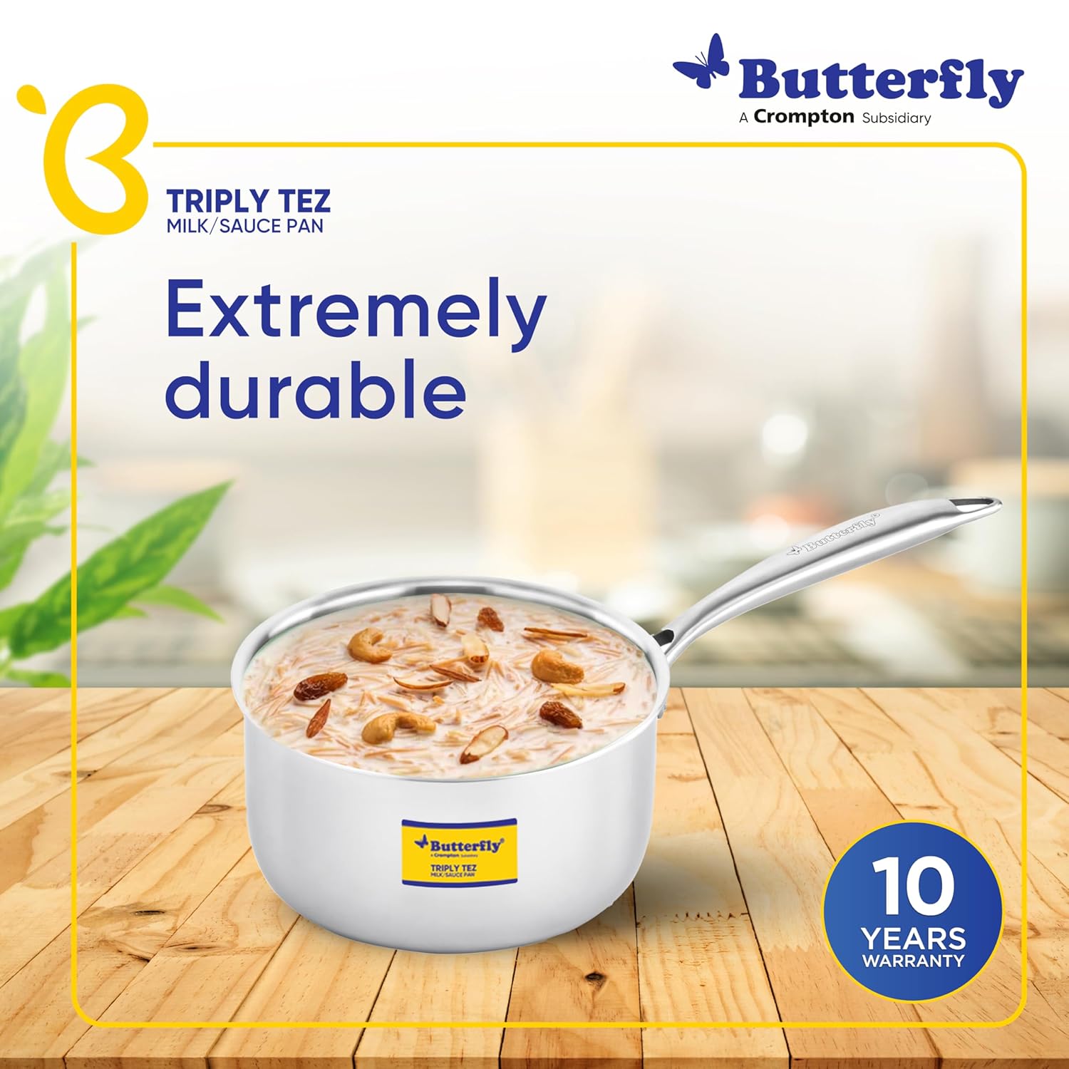 Butterfly Tez Triply Milk / Sauce Pan With SS Lid ensures rapid and uniform heat distribution across its surface. Say goodbye to unevenly cooked meals - Savor perfection in every bite. Elevate your culinary expertise with consistent results, every time you cook.