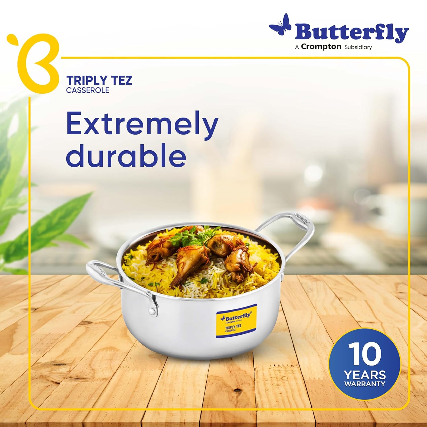 Butterfly Tez Triply Casserole ensures rapid and uniform heat distribution across its surface. Say goodbye to unevenly cooked meals - Savor perfection in every bite. Elevate your culinary expertise with consistent results, every time you cook.