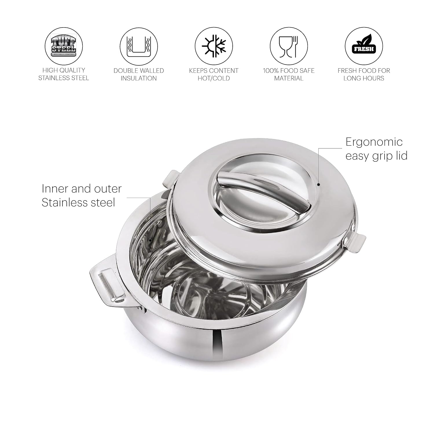 * Feature: BPA-free, Food grade with thermi-guard, tuff steel specially crafted, temperature maintained for longer hours, comfortably use the open and close lid, Inner & outer stainless steel casserole, and simple to clean, strong, safe and sturdy handle, resistant to corrosion