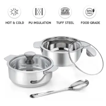 Introducing the Daawat Insulated Casserole Set, featuring two elegantly designed casseroles Siver with a generous each 1000ml capacity + Serving Spoon. This set provides you with two essential insulated casseroles, perfect for keeping your favorite dishes hot and delicious. The inner mirror finished liner parts are fabricated out of a non-magnetic stainless steel seat. The plastic outer body and lead components are molded out of virgin food grade plastic polymers which gives a sturdy and beautiful finish. With a unique glazed finish that gives a sophisticated look, is one of the superlative essential in your kitchen collections. Whether you're serving up hearty stews or delectable casseroles, these casseroles ensure your meals stay warm and flavorful, making them a must-have addition to your kitchen arsenal.