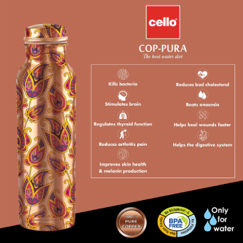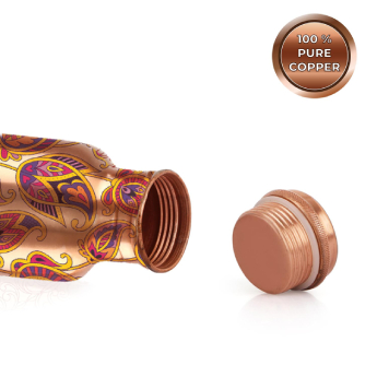 Copper is a strong anti-oxidant that promotes healthy skin, improves digestion, is anti-carcinogenic and much more as mentioned in Ayurveda. Drinking water stored in copper bottle or glass(also known as tamra jal in Ayurvedic medicine) balances the three doshas in our body (vata, kapha & pitta). Water stored in a copper vessel will also become alkaline water, which helps balance your body's pH levels. Copper is anti-bacterial, acts as an effective anti-oxidant, improves immunity, supports good health, eliminates toxins and stimulates the brain. Since copper is naturally anti-bacterial and self-sterilizing hence maintain freshness of your water. With an attractive design the copper bottle is perfect for both personal use and for gifting.