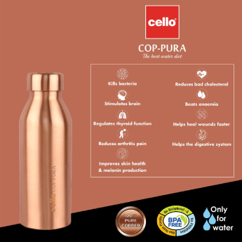 Copper is a strong anti-oxidant that promotes healthy skin, improves digestion, is anti-carcinogenic and much more as mentioned in Ayurveda. Drinking water stored in copper bottle or glass(also known as tamra jal in Ayurvedic medicine) balances the three doshas in our body (vata, kapha & pitta). Water stored in a copper vessel will also become alkaline water, which helps balance your body's pH levels. Copper is anti-bacterial, acts as an effective anti-oxidant, improves immunity, supports good health, eliminates toxins and stimulates the brain. Since copper is naturally anti-bacterial and self-sterilizing hence maintain freshness of your water. With an attractive design the copper bottle is perfect for both personal use and for gifting.
