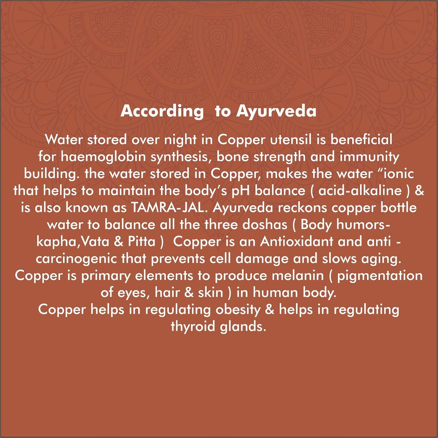 Copper is a strong anti-oxidant that promotes healthy skin, improves digestion, is anti-carcinogenic and much more as mentioned in Ayurveda. Drinking water stored in copper bottle or glass(also known as tamra jal in Ayurvedic medicine) balances the three doshas in our body (vata, kapha & pitta). Water stored in a copper vessel will also become alkaline water, which helps balance your body's pH levels. Copper is anti-bacterial, acts as an effective anti-oxidant, improves immunity, supports good health, eliminates toxins and stimulates the brain. Since copper is naturally anti-bacterial and self-sterilizing hence maintain freshness of your water. With an attractive design the copper bottle is perfect for both personal use and for gifting.
