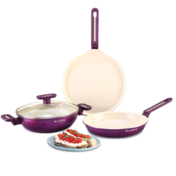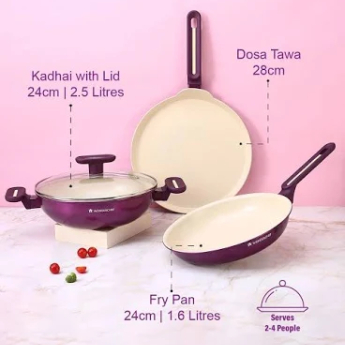 | Set Includes | Dosa Tawa 28cm, Fry Pan 24cm | 1.3L Kadhai with Lid 24cm | 2L |