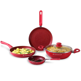 Wonderchef non-stick cookware is crafted from cold rolled sheets of 99.9% pure-grade virgin aluminium. The cookware comes with proprietary multi-layered healthy non-stick coatings like Meta-Tuff, Greblon C3, etc., and specially molded for ergonomic use. The non-stick coating is food-safe, free from PFOA, PFAS, and other harmful metals, making Wonderchef non-stick cookware the healthiest.