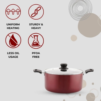 Experience hassle-free cooking with our Beautiful Triple Layer Coating Non Stick Kadhai/Kadai by Pencil. Its robust coating ensures lasting durability and effortless cooking. Crafted without harmful substances, it offers safety and versatility, compatible with various cooktops, and includes a Red colored non-stick Kadhai/Kadai with glass lid for all your culinary needs.