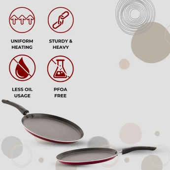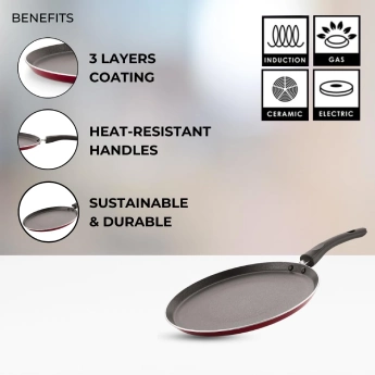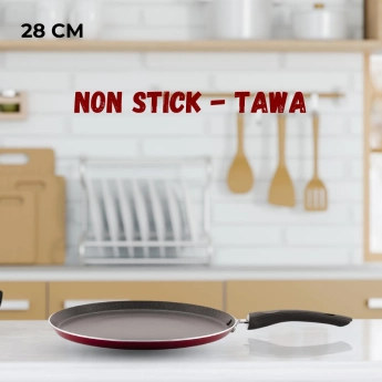 Experience hassle-free cooking with our Beautiful Triple Layer Coated Non Stick Tawa by Pencil. Its robust coating ensures lasting durability and effortless cooking. Crafted without harmful substances, it offers safety and versatility, compatible with various cooktops, and includes a Red colored 28 cm non-stick Tawa with cool-touch handle for all your culinary needs.