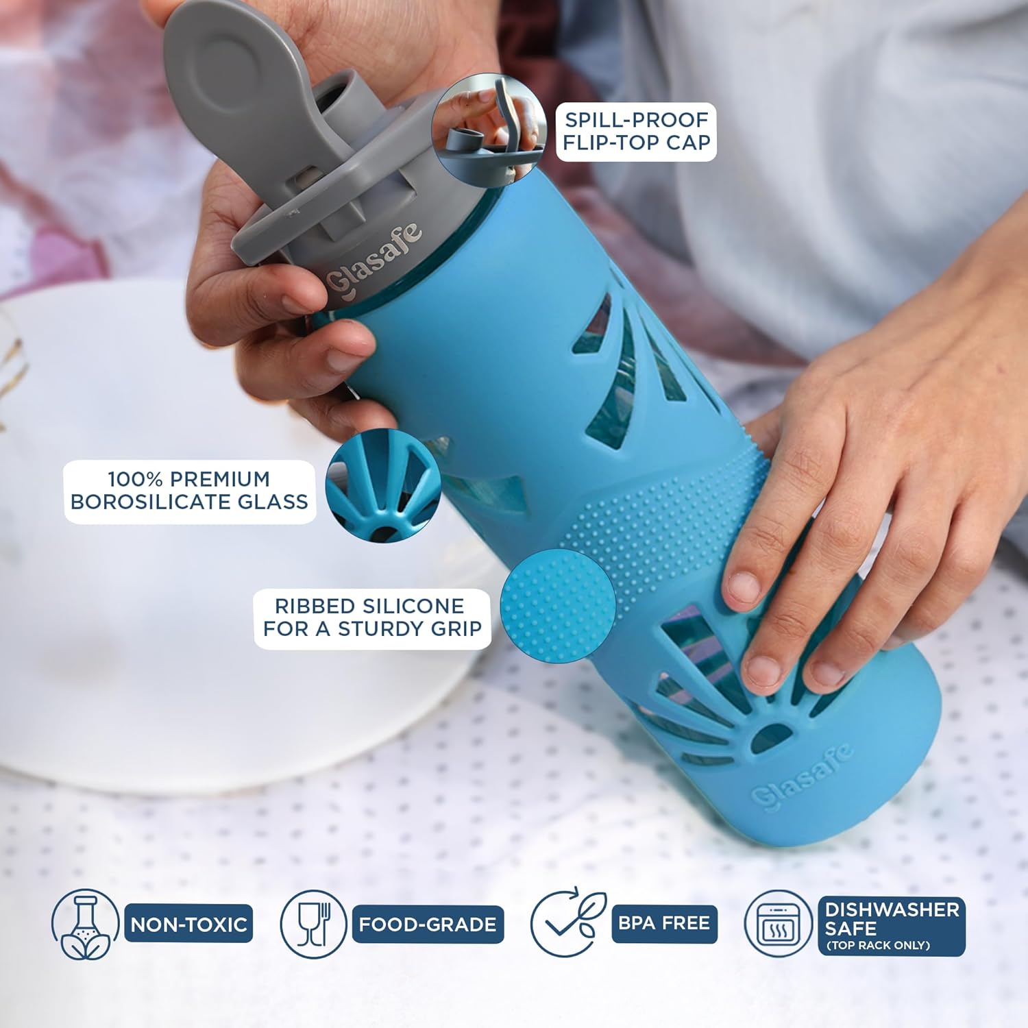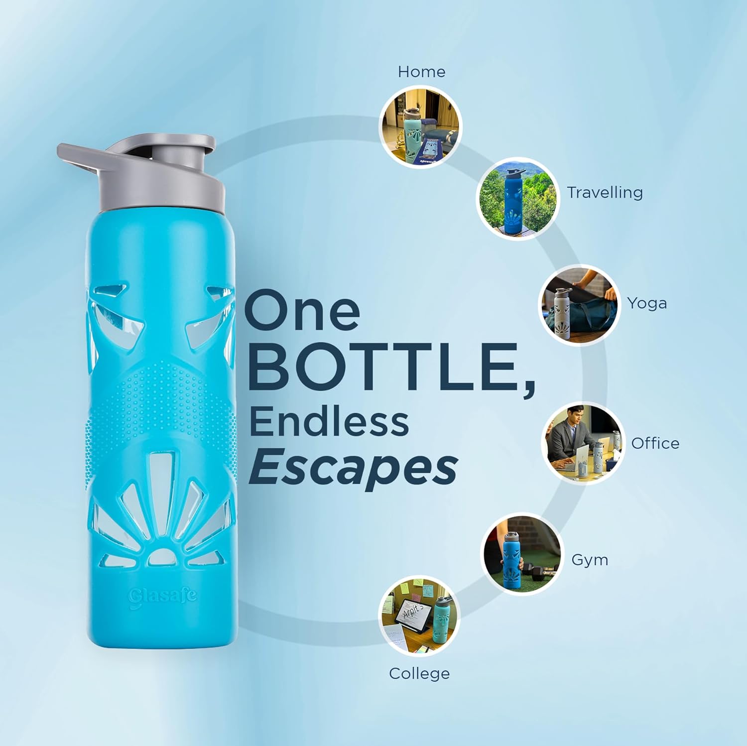 The glass water bottle with cover is designed ergonomically to fit perfectly into your everyday lifestyle. These drink bottles online are made of 100% borosilicate glass to ensure you experience premium hydration wherever you are. Designed for everyday use, these glass water bottles are an excellent drinkware for carrying to college, the office, the gym, or shopping. This leak-proof water bottle comes with a flip-top lid that seals the water inside the bottle. The silicone sleeve of the water bottle for office ensures a secured, anti-slip grip and extra protection from mishaps.