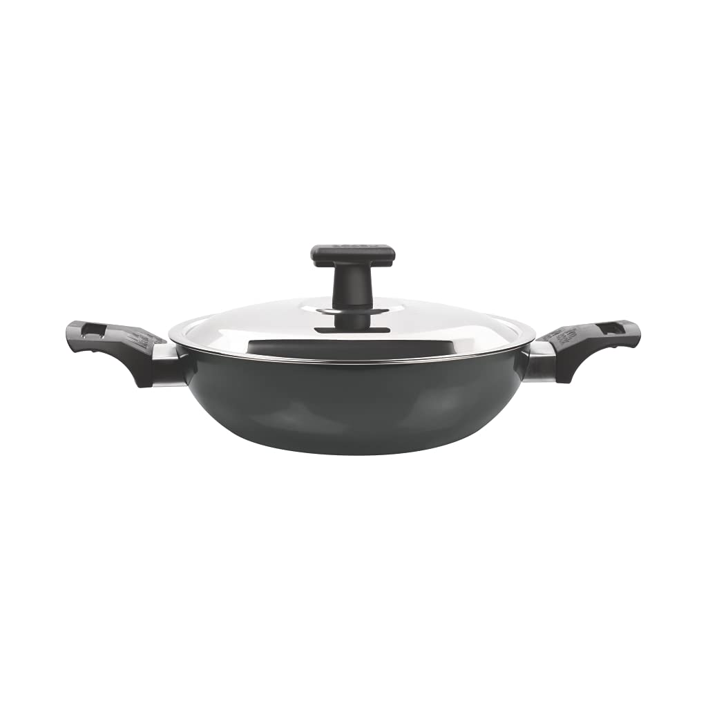 Introducing Hard Anodized Kadhai with Stainless Steel Lid. It is two times harder than any alloyed steel which makes this cookware very durable and scratch resistant. Hard anodized aluminum is great as a heat conductor. It spreads heat evenly and perfectly. It is stable to use with spoon and spatula for your cooking convenience. These pans have a strong aluminum body with Sturdy riveted bakelite handles for long lasting usage. The lid helps to retain the heat within, which makes the food cook faster. This is ideal to cook delicious meals, vegetables, fry papadums, samosas and cook world-class curries. These kadhai are easy to clean and compatible with Induction, Flame, Gas Stove, Hot Plate.