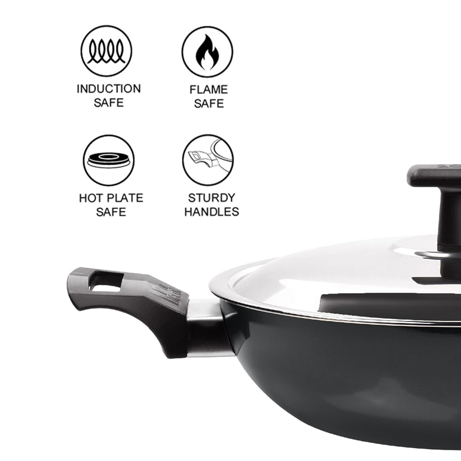 * The kadai features ergonomically designed, sturdy handles that provide a secure and comfortable grip, staying cool during cooking for safe handling, even when hot. These handles offer excellent control when transferring or adjusting the kadai. It also comes with a high-quality, rust-resistant stainless steel lid that fits snugly to trap heat, moisture, and flavors, perfect for simmering or slow cooking. The lid features an ergonomic handle for easy lifting and checking on your food.