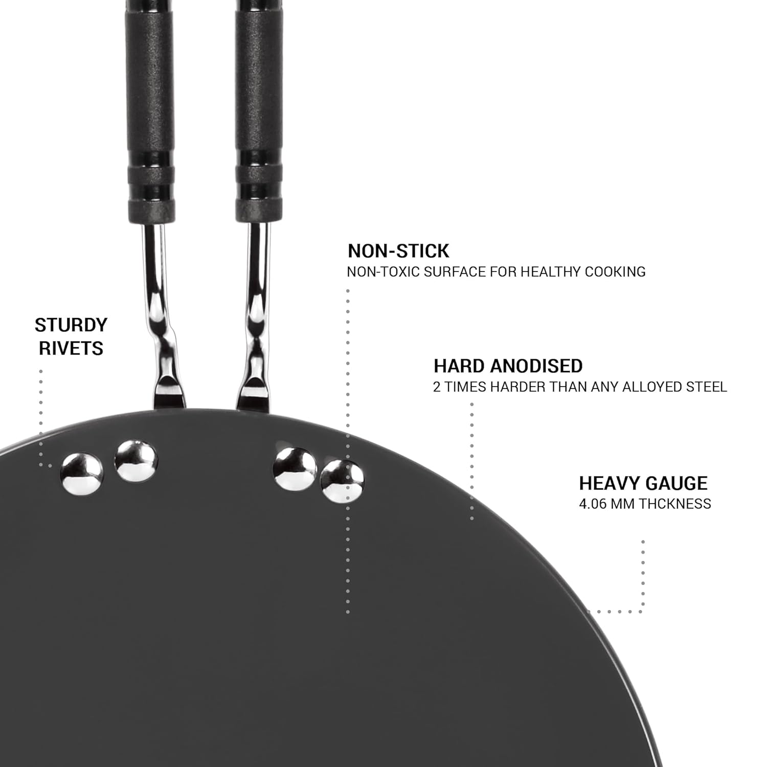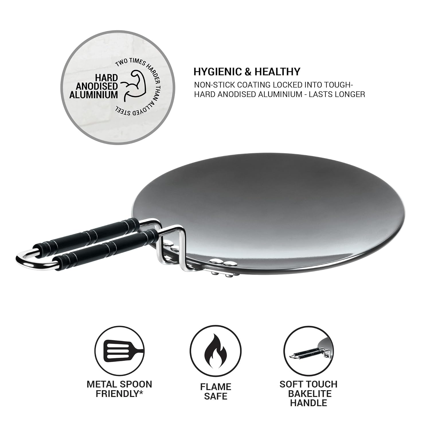 * Made with Pride: Crafted with precision from Hard Anodized Aluminium, this tawa features a 5 mm thick base that ensures superior heat distribution, allowing for even cooking without hot spots. The robust construction guarantees lasting performance, making it ideal for daily use.