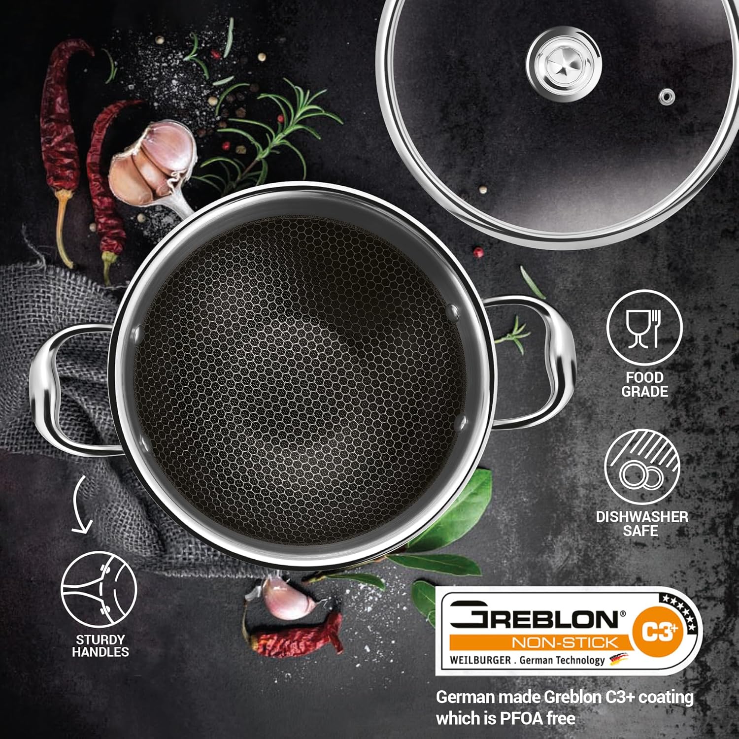 Presenting Milton Pro CookTriply Hexa Tech Induction Non-Stick Kadhai With Glass Lid which is made up of Three different layers of metal bonded together top & bottom stainless steel with an encapsulated layer of aluminum in the middle right throughout the cookware for an even heat distribution. The non-stick kadhai comes with a Glass lid that has a durable handle on the top. The lid traps the steam and aroma of the ingredients inside. This makes the cooking process faster and efficient, also enhancing the flavor of your curries. It cooks all your meals to perfection. This cookware features two sturdy handles to offer a firm and comfortable grip. These handles provide optimum support while carrying the kadhai. It enables the user to cook and stir with ease. The handle's curvature gives the user a stable grip while handling the kadhai at full capacity. This kadhai is flame safe, hotplate safe, induction safe and dishwasher safe. Its seamless and sheen structure can be cleaned with ease.