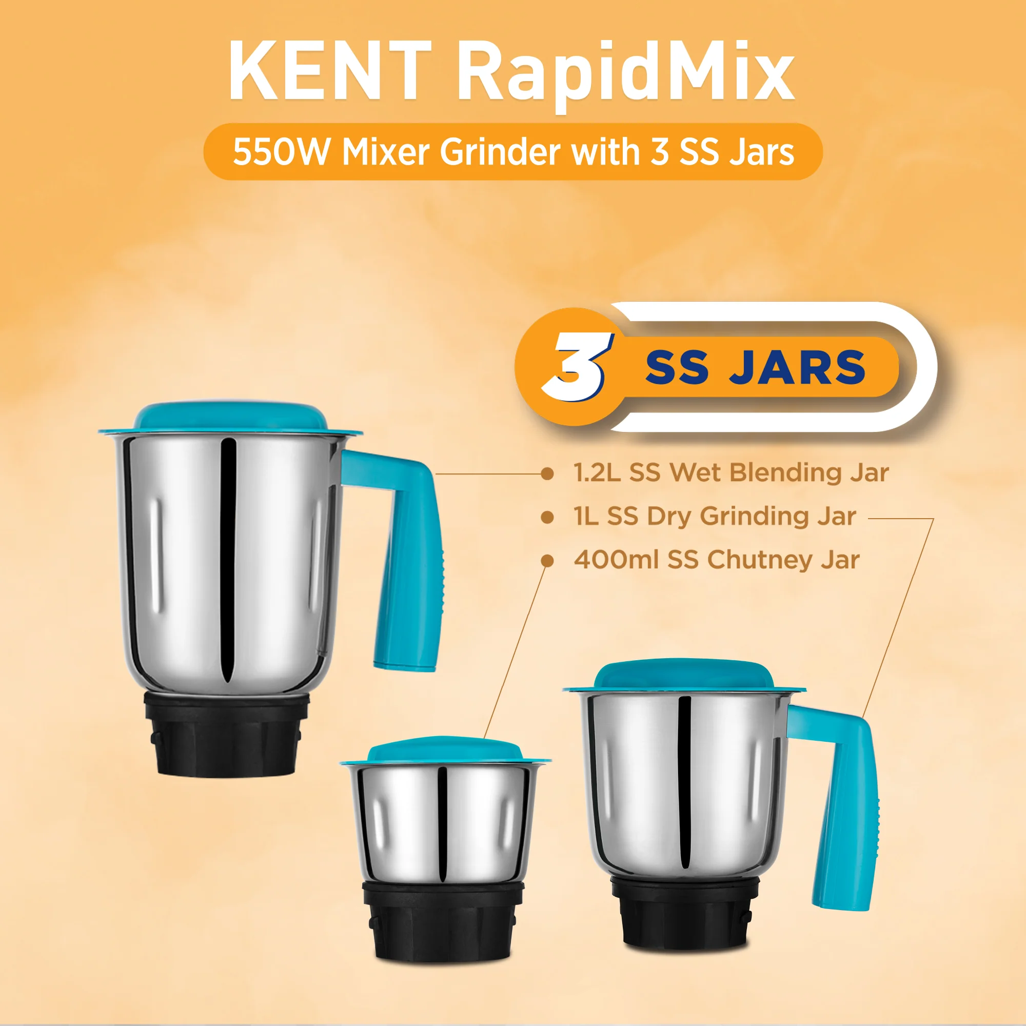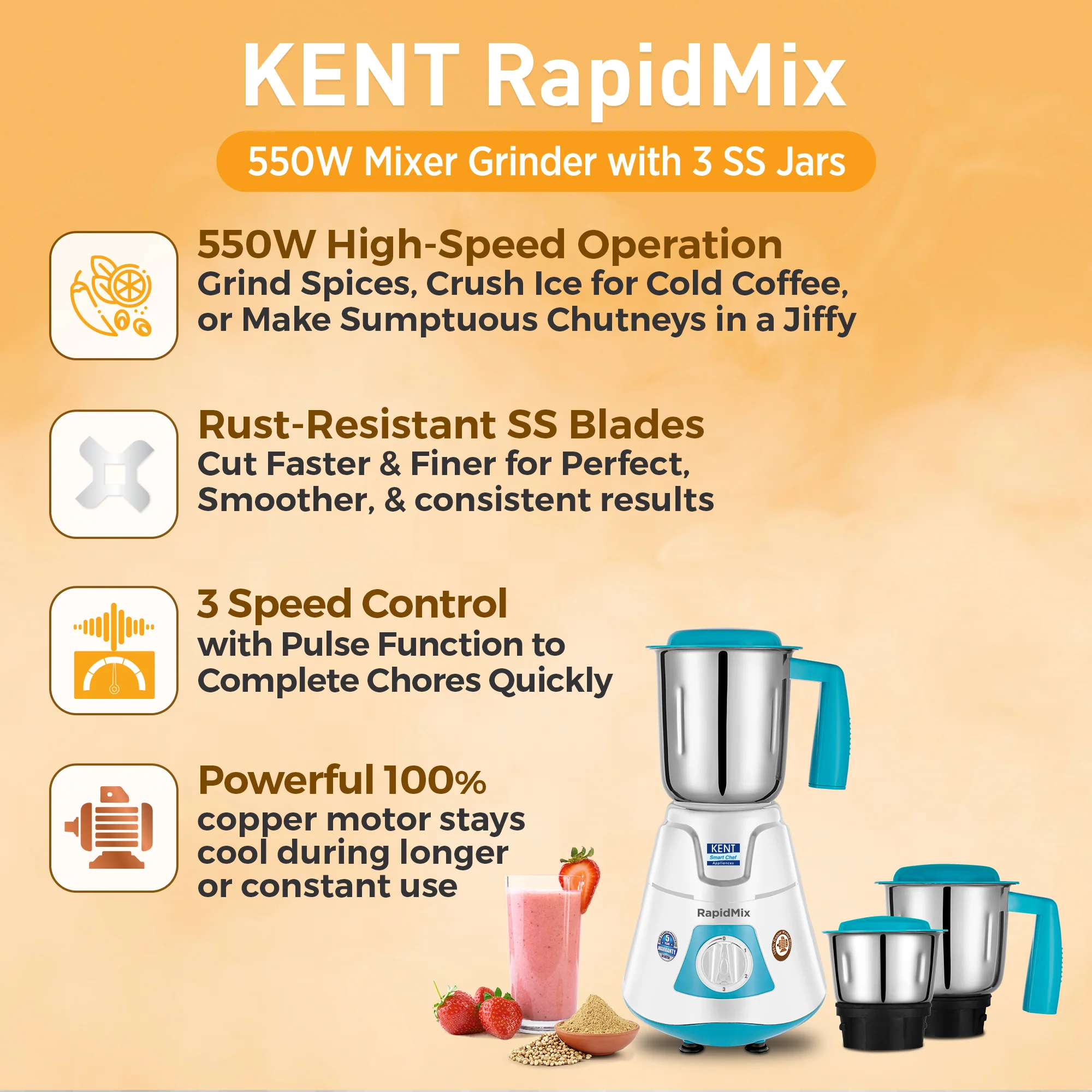 KENT RapidMix Mixer Grinder is a high-speed mixer cum blender for daily mixing, grinding, crushing, & mixing 100% Copper 550 W motor offers quickest and easiest way to grind or mix at a press of button It comes with 1.2 L SS Wet Blending Jar, 1 L SS Grinding Jar, and 400 ml SS Chutney Jar The high quality sharp stainless-steel blades give perfect, smoother, and consistent results Overheat & overcurrent protection saves you and your machine from any unexpected mishap. Pulse function and 3 speed control lets you easily adjust the speed according to certain ingredients or food items for the right texture It has a long power cord for your optimum convenience KENT RapidMix offers a 2-year warranty on the product and 5-years warranty on motor to give you peace of mind.