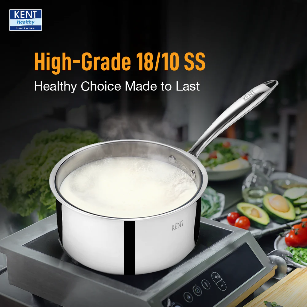Boiling milk, water, or eggs, making tea, coffee, soup, or instant noodles, these are some of the regular chores of Indian kitchen. Using an aluminium cookware for these purposes may affect your health as it leaches into the food and SS cookware can make the food burn and add foul smell to it. Introducing KENT Tri-Ply Sauce Pan with SS Lid, featuring 18/10 and 0.5 mm thick SS inner layer that does not react with food, 2.0 mm thick heavy aluminium middle layer that helps maximize even spreading of heat and minimise sticking and burning of food, and 0.5 mm thick SS outer layer, so you can cook on induction cooktops, gas stoves, halogen, & ceramic cooktops. It comes with a sturdy SS lid that helps you conceal the heat and flavours inside for that flavourful cooked food every single time. It also has a cool-touch diecast handle which is convenient to use.