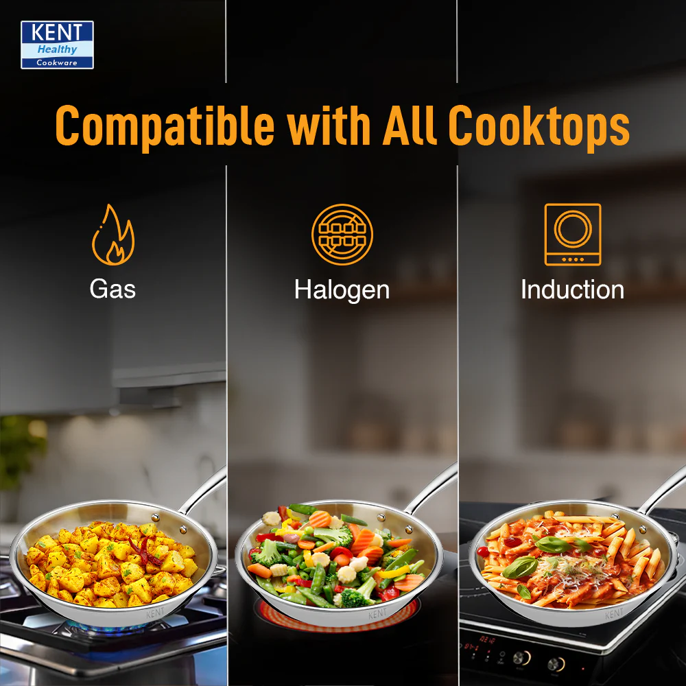 Indian cooking requires high levels of heat especially for frying, sauteing, etc. Cookware made of aluminium tend to leach into food and can be harmful while SS cookware can make the food burn and add foul smell to it. Presenting KENT Tri-Ply Frying Pan with SS Lid so you can cook using varied levels of heat without losing the taste and nutrients of your food. KENT Frying Pan has 0.5 mm thick food grade 18/10 SS innermost layer that helps keep the nutrients and flavours of the food intact, 2.0 mm aluminium middle layer for uniform distribution of heat and prevent against sticking & burning of food, and 0.5 mm thick induction friendly SS outer layer to make it suitable for all kinds of cooktops. It comes with a cool-touch diecast handle and ss lid for further convenience. Perfect for Indian style cooking, you can use KENT frying pan to make omelette, toast, pancakes, stir-frying vegetables, alu tikki, patties, fish-fry, chicken-fry, uttapam, poha, etc.