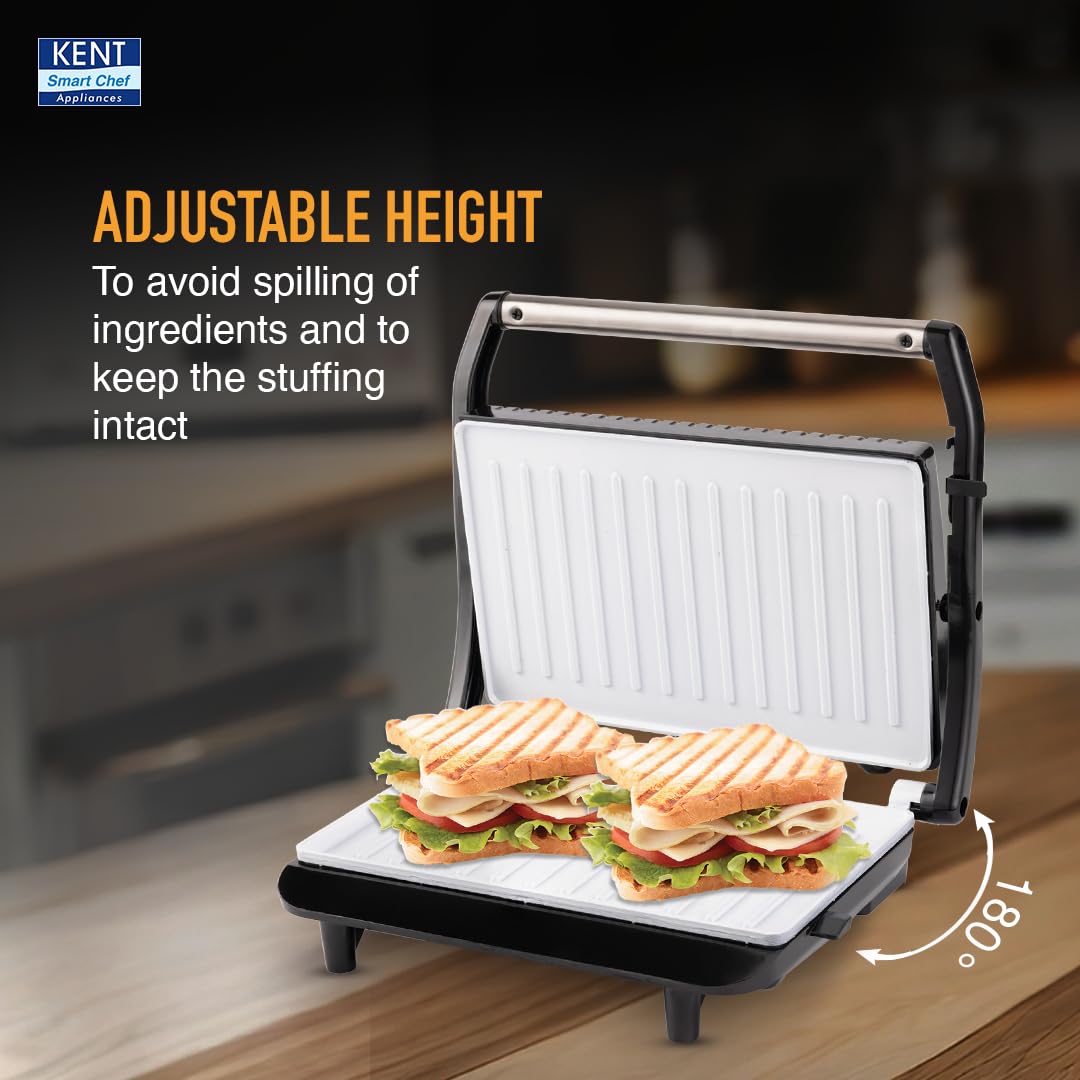 KENT Sandwich Grill is a compact yet multifunctional kitchen appliance for your afternoon breaks or evening snacks. A great product that helps you easily grill, toast, roast, or make sandwiches within minutes. Its automatic temperature cut off turns off the appliance once your dish is perfectly cooked, so you need to sit around the grill every time. With other features like ergonomic handle and non-toxic ceramic coating, the sandwich grill can be put for everyday use.