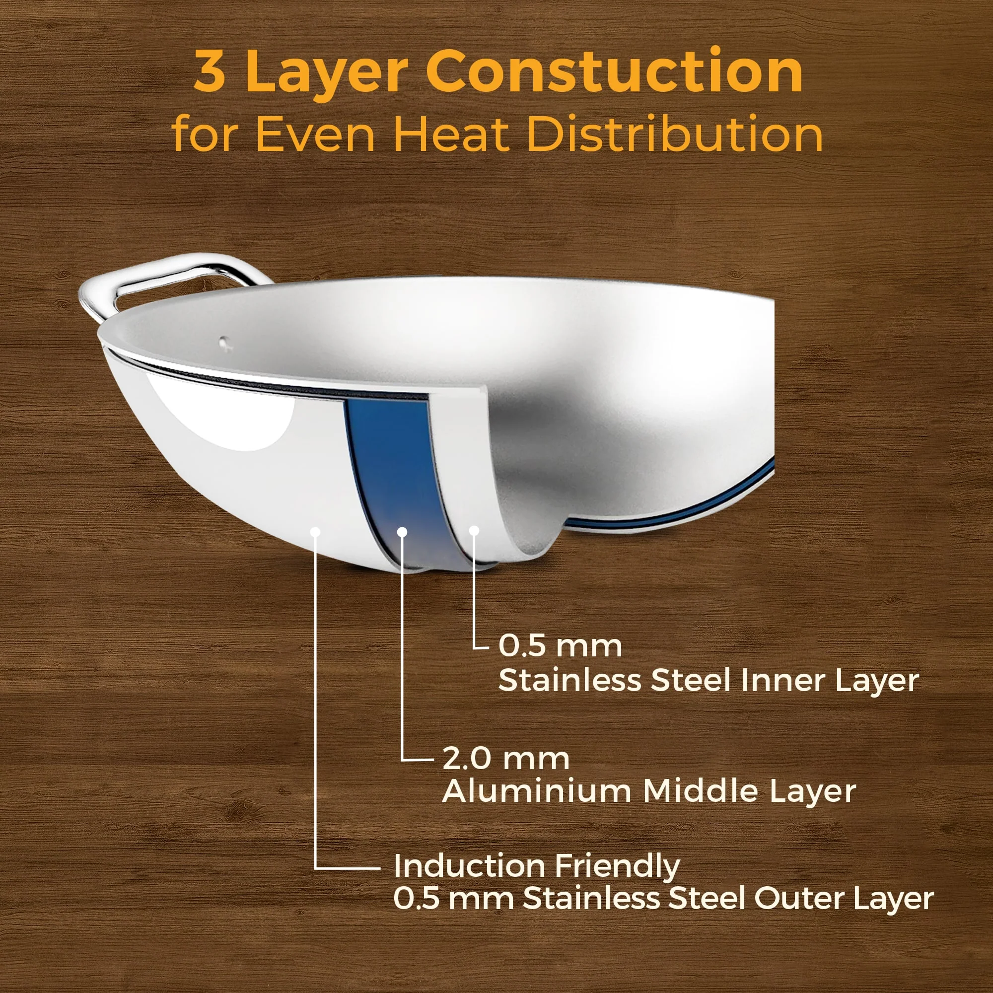 Kadai experiences high levels of heat and is used for deep & shallow frying, sauteing, stir frying, make curries, etc. Aluminium leaches into food that can be harmful and SS can make the food burn add foul smell to it. Presenting KENT Tri-Ply Kadai with SS lid to let you enjoy the benefits of both stainless steel and aluminium. KENT Kadai has a triple layered construction with 0.5 mm thick superior food grade 18/10 stainless inner layer that does not react with food, 0.5 mm thick induction friendly stainless steel outer layer, and 2.0 mm thick aluminium middle layer that ensures faster cooking and minimize sticking with even heat distribution. It also comes with a strong SS lid and cool-touch SS hollow cast handle, so you can use it with maximum convenience. Best of all, it is suitable for induction, gas, and halogen cooktops.