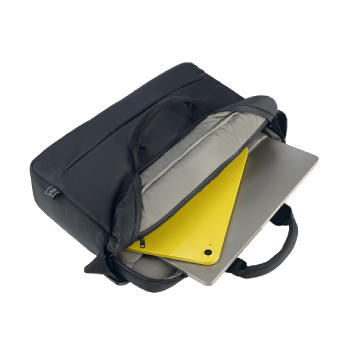 This sleek and compact laptop bag is thoughtfully designed with eco-conscious materials, crafted from durable fabric made from recycled plastic. It offers a perfect fit for Laptops & MacBooks, making it an ideal choice for those who prioritize both style and sustainability. Trolley Attachment Panel Non-Removable Shoulder Strap The bag features a spacious central compartment with a padded interior pocket to protect your laptop from bumps and scratches. The front exterior includes a well-organized pocket with a secure zipper closure, perfect for storing smaller essentials like your phone, chargers, and other accessories, ensuring quick and easy access.