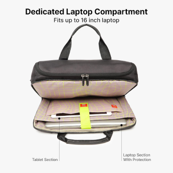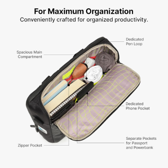 * Organized Storage Smart compartments for accessories, notebooks, and more