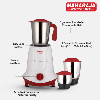 The Maharaja Whiteline Unigrind Mixer Grinder is powered with a 500W motor for a breakthrough performance. It delivers a motor speed of 20,000 RPM to mince your food flavours efficiently.Considering 2 minutes of resting time after every 5 minutes operation at standard condition.Making it certain that your food remains alright inside the jars and doesn’t heat up, the Unigrind Mixer Grinder operates with cooler operation. It ensures comparatively longer grinding and lesser over heating.