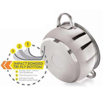 NIRLON Impact Bonded Stainless Steel Cookware makes your cooking healthy , quick and easy. Impact Bonded tri-ply technology implies three different layers of metal bonded together. Stainless steel-Aluminum-Stainless Steel under high impact to form a bottom eliminating air gaps between the metal layers making the bottom eliminating air gaps between the metal layers making the bottom highly durable while ensuring the distribution of heat quick and easy.
