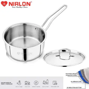 The NIRLON Tri-Ply SP14 is a 14 cm (140 mm) saucepan designed for efficient and healthy cooking. Its tri-ply construction ensures even heat distribution, making it suitable for various cooking methods.