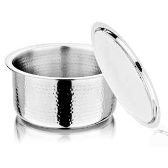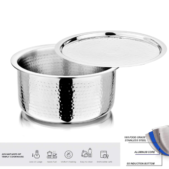 NIRLON newest Hammered Series is Triply construction stainless steel cookware designed for your daily cooking requirements, for preparing healthy, flavorful meals for your family and friends. The cookware is built by carefully infusing the highest-grade metals, together for a seamless one-piece shiny cookware. Inner SS 304 stainless steel resists acidic foods and solutions to provide great tasting meals and avoid discolouration in food. Also, the non-reactive 18/10 surface resists heavy metal atoms from mixing in your food. The aluminium core provides uniform heat distribution throughout the cooking surface and retains heat within itself to help you burn 50% less gas/electric power per square millimetre of the cooking surface. The outermost 18/0 layer of magnetic steel provides a robust cover to inner surfaces while resisting rust and evenly conducting heat around the cookware body. The Hammered Range of cookware is designed robustly to ensure cooking seems less like a chore.